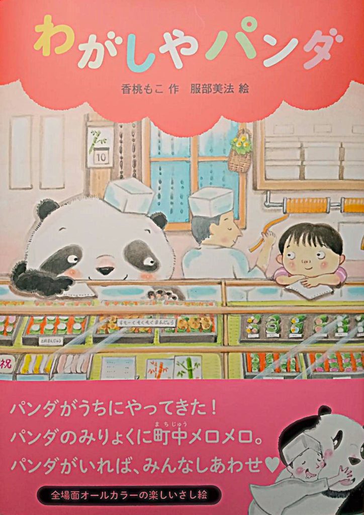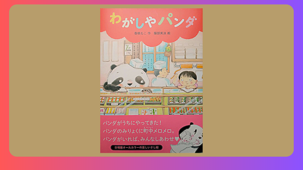 このわがしやパンダ、洋菓子人気におされてお客さんが減って困っている和菓子屋さんに、人と話のできる旅のパンダが立ち寄り、一緒にお店を盛り上げていくという物語。